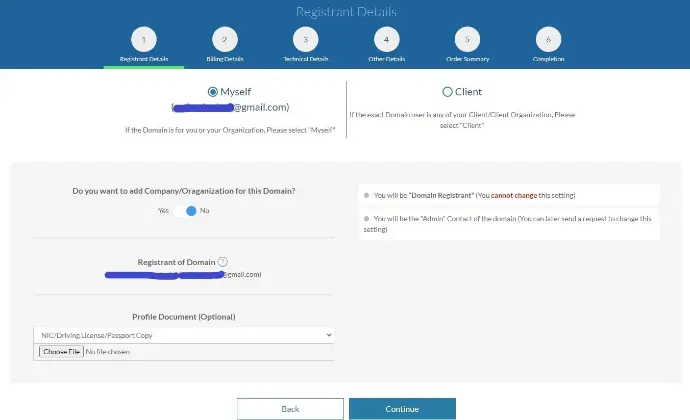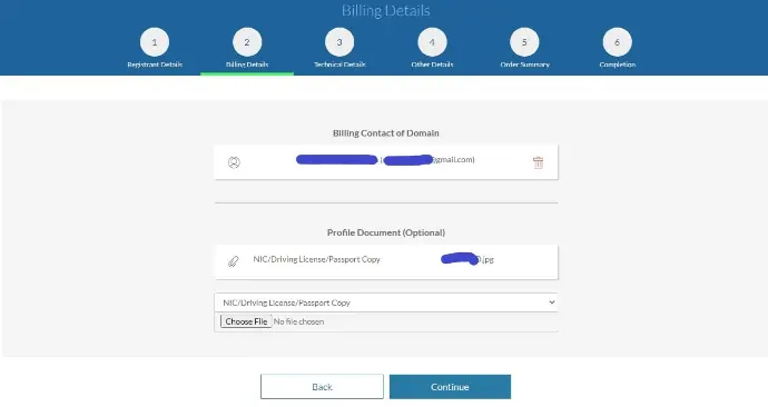 Find your already created email address and add your main address as your Billing Contact of Domain address. Click Continue.