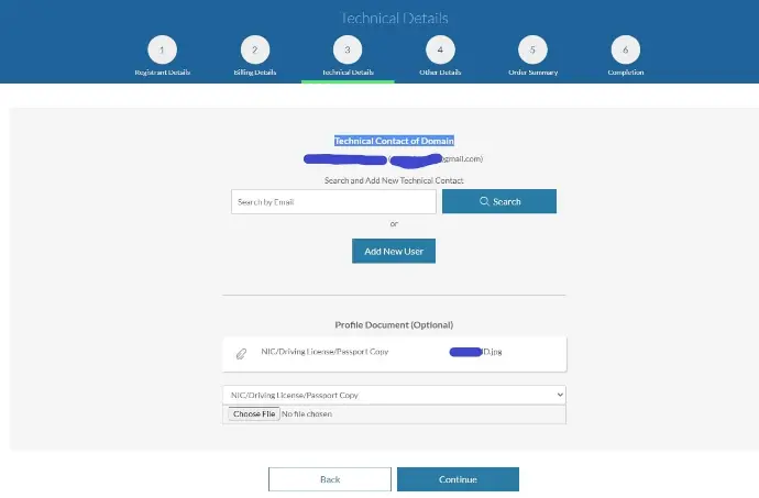 Add and search mail address or Add New User technical contact. Click Continue