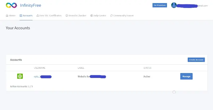 Click on Open Control Panel or login to https://app.infinityfree.net/accounts and click on Manage – > Control Panel